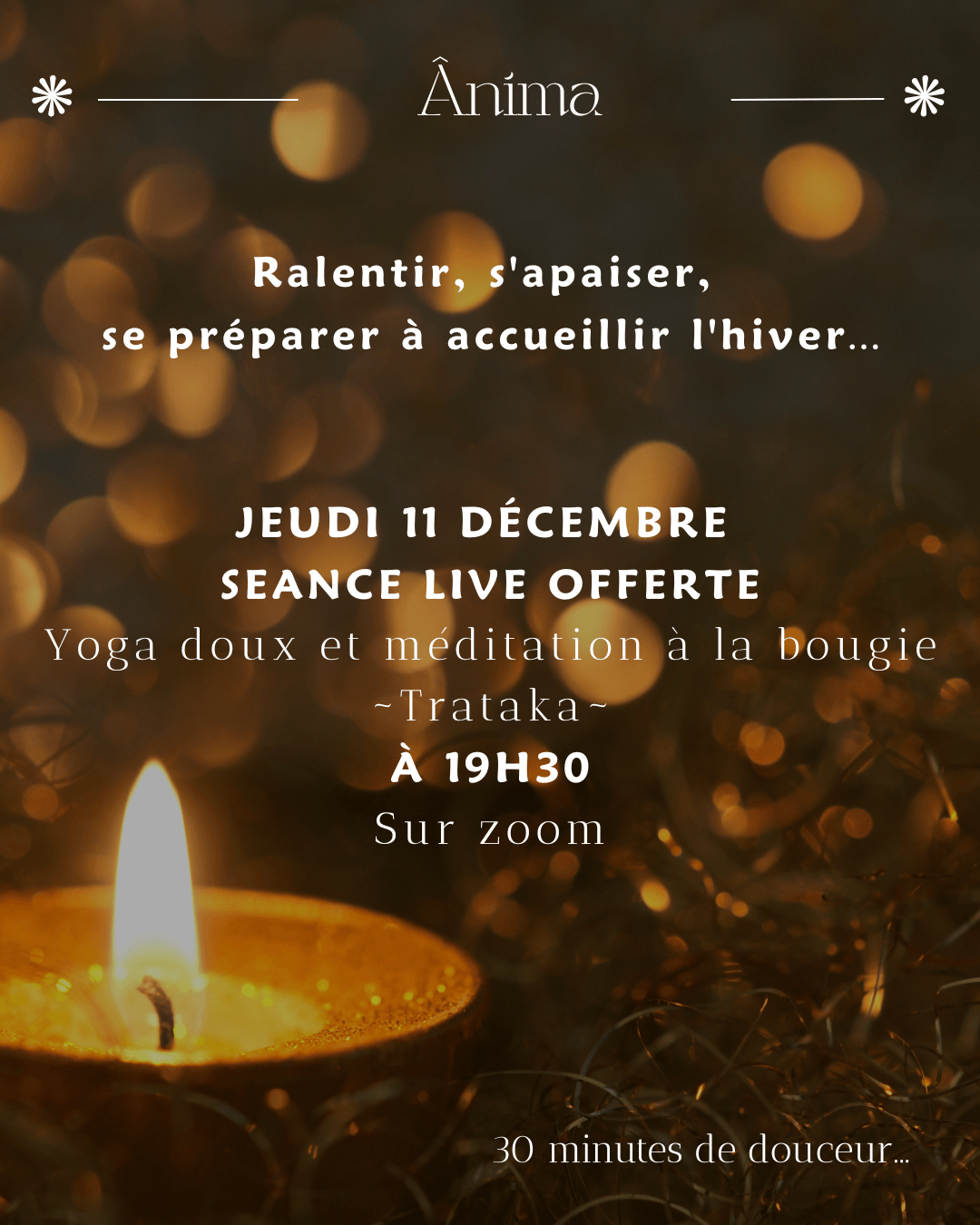 C'est une pratique douce d'accès à la méditation où l'on fixe la flamme d'une bougie pour apaiser le mental. La flamme est vivante, douce, captivante... Elle aide à la concentration sans effort, on la regarde, on respire... et tout se pose.